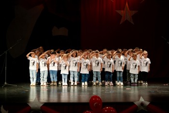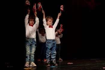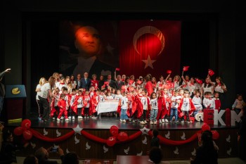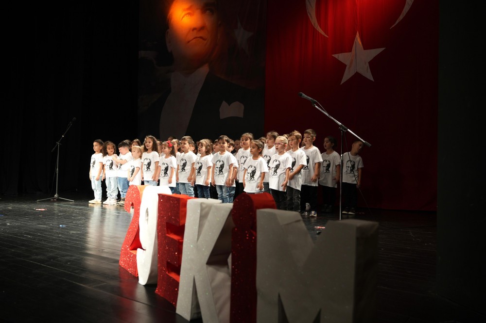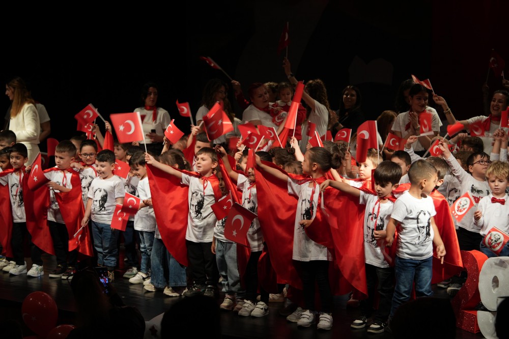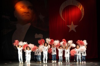 Atatürk baskılı tişörtler giyen minikler, Türk bayrakları ve kırmızı beyaz kıyafetleriyle yaptıkları gösteride izleyenlerden büyük alkış aldılar.