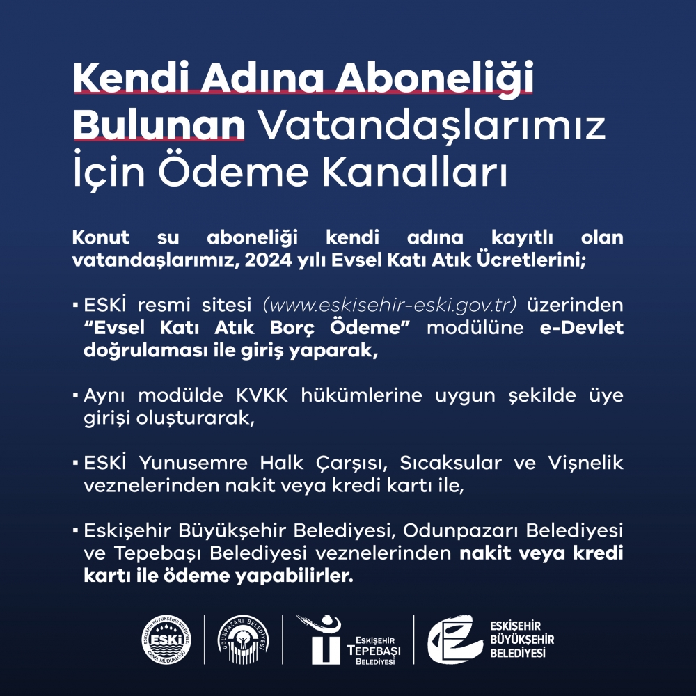 Konut su aboneliği kendi adına kayıtlı olan vatandaşlarımız, 2024 yılı Evsel Katı Atık Ücretlerini;