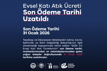 Tepebaşı ve Odunpazarı Belediyeleri adına, Çevre, Şehircilik ve İklim Değişikliği Bakanlığı’nın ilgili yönetmeliği kapsamında tahsil edilen “2024 Yılı Evsel Katı Atık Ücretlerinin” son ödeme tarihi, muhtarlarımızdan ve vatandaşlarımızdan gelen yoğun talep ve veznelerde yaşanan yoğunluk sebebiyle 31 Ocak 2026 tarihine uzatılmıştır.