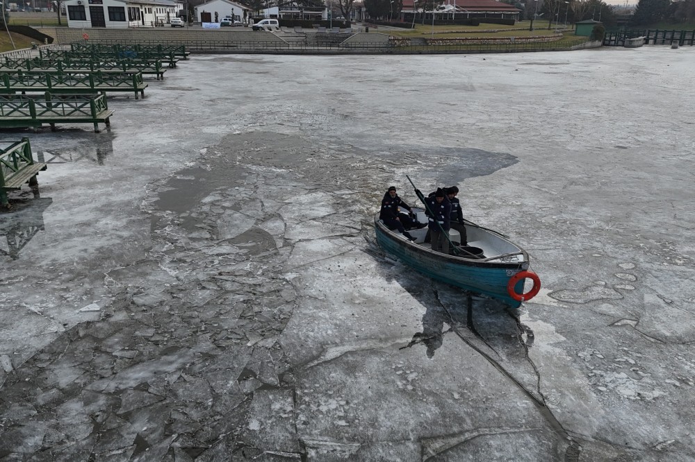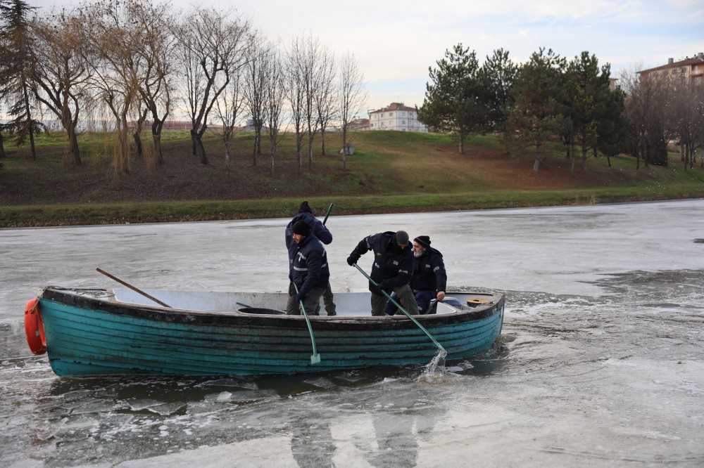 Buz tabakasının kalınlığının her noktada aynı olmadığını ve kolayca kırılabileceğini belirten belediye ekipleri, olası kazaların önüne geçmek için kollarını sıvadı. Porsuk Çayı ve yapay göletlerde buz kırma işlemleri aralıksız sürdürülüyor.
