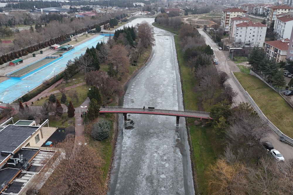 Eskişehir’de hava sıcaklıklarının hızla düşmesiyle birlikte şehrin simgesi Porsuk Çayı ve çevresindeki yapay göletler buzla kaplandı. Kartpostallık görüntülerin oluştuğu şehirde, Büyükşehir Belediyesi vatandaşları buz tabakasının oluşturabileceği risklere karşı dikkatli olmaya çağırdı.