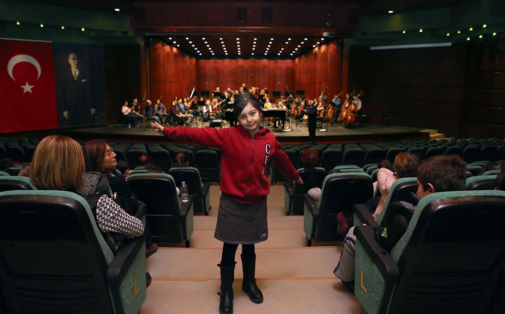 Özel Okulun, anaokulu ve ilkokulundan 200’e yakın öğrenci öğretmenleriyle birlikte Büyükşehir Belediyesi Sanat ve Kültür Sarayı’na geldiler. Sahnede prova yapan Senfoni Orkestrası Şefi Işın Metin, küçük öğrencilere klasik müziği, orkestra üyelerini ve çaldıkları enstrümanlarla ilgili bilgi verdi.