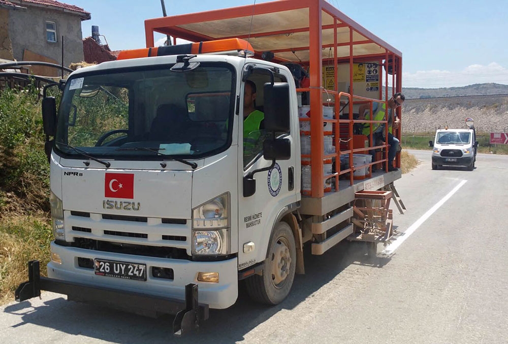 Büyükşehir Belediyesi ekipleri tarafından şehir merkezi, ilçe, köy ve mahalle yollarında bakım ve onarım çalışmaları tamamlanan yollarda trafik güvenliğinin sağlanması amacıyla şerit ve çizgi boyama çalışmaları tüm hızıyla devam ediyor.