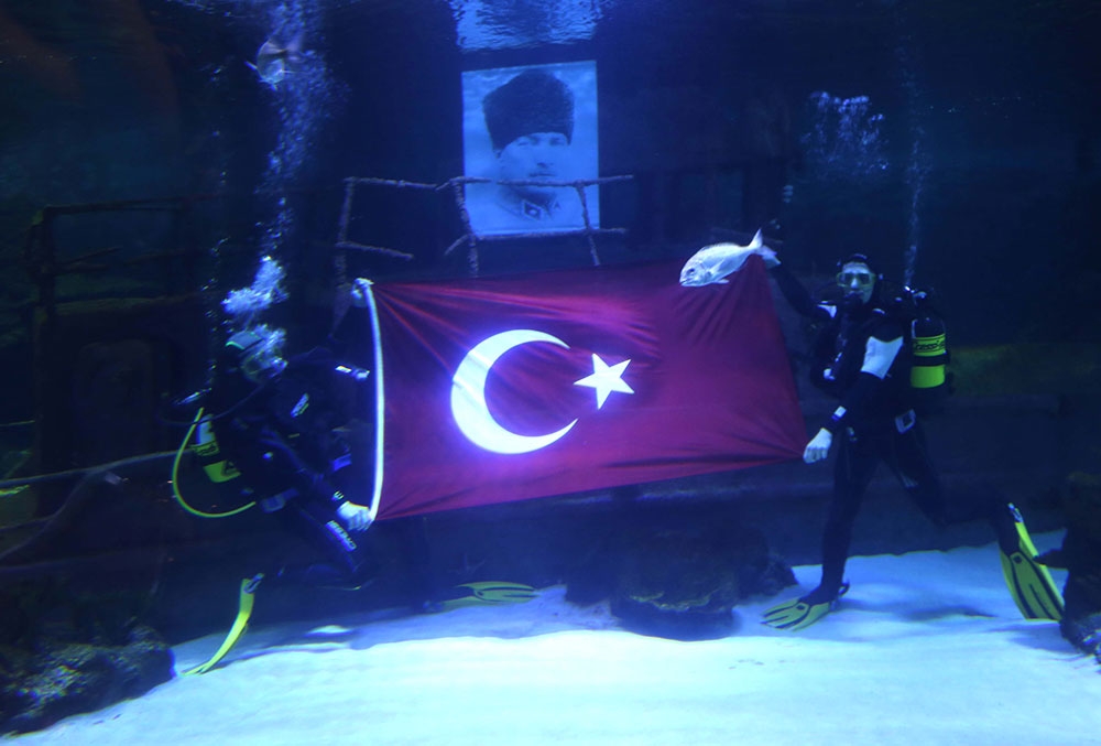 Sazova Bilim Kültür ve Sanat Parkı’nda bulunan ve vatandaşların büyük ilgi gösterdiği Eti Sualtı Dünyası, 30 Ağustos Zafer Bayramını büyük akvaryumda vatandaşların büyük ilgi gösterdiği bir etkinlikte kutladı. 10 Yıl Marşı eşliğinde Eti Sualtı Dünyası dalgıçları, köpek balıklarının da bulunduğu büyük akvaryuma girerek Türk Bayrağı ve Atatürk posteri açtı. Büyük bir ilgiyle izlenen kutlama sırasında ziyaretçiler de bol bol fotoğraf çekerek marşlara eşlik ettiler.