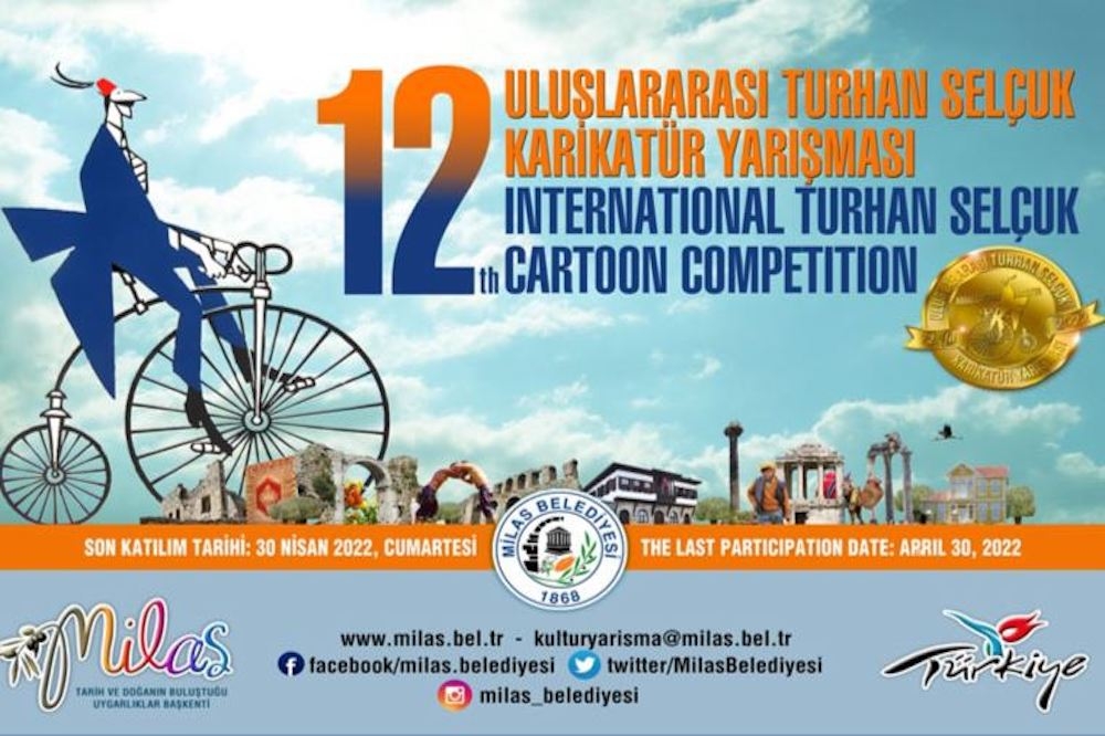 18 Mayıs 2022 tarihinde sonuçları açıklanacak olan 12. Uluslararası Turhan Selçuk Karikatür Yarışması’nın kapıları tüm çizerlere açık. Tekniğin serbest olduğu yarışmaya en fazla beş eserle katılım sağlanabiliyor. 30x40 cm boyutunda olması gereken eserler ad, soyad, adres, e-posta, telefon numarası ve katılım sağlanan ülke bilgileri ile birlikte “12. Uluslararası Turhan Selçuk Karikatür Yarışması Milas Belediyesi Kültür ve Sosyal İşler Müdürlüğü 48200 Milas-Muğla/TÜRKİYE” adresine posta yoluyla 30 Nisan 2022’ye kadar gönderilebilecek.