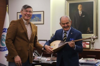 Ziyaret, Eskişehir ve Kazakistan hakkında bilgi alışverişi yapılarak devam etti. Kazakistan Büyükelçisi Abzal Saparbekuly, Başkan Büyükerşen’e geleneksel sazları olan dombra takdim etti.