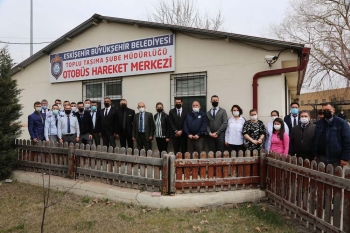 Başkan Büyükerşen ziyaret sonrası Ulaşım Dairesi Hareket Merkezi personeli ile hatıra fotoğrafı çektirerek, tüm personele kolaylıklar diledi.