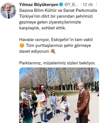 Sosyal medya hesabından çağrıyı duyuran Başkan Büyükerşen, “Sazova Bilim Kültür ve Sanat Parkımızda Türkiye’nin dört bir yanından şehrimizi gezmeye gelen ziyaretçilerimizle karşılaştık, sohbet ettik. Havalar ısınıyor, Eskişehir’in tam vakti. Tüm yurttaşlarımızı şehir görmeye davet ediyorum. Parklarımız, müzelerimiz sizleri bekliyor” dedi.