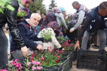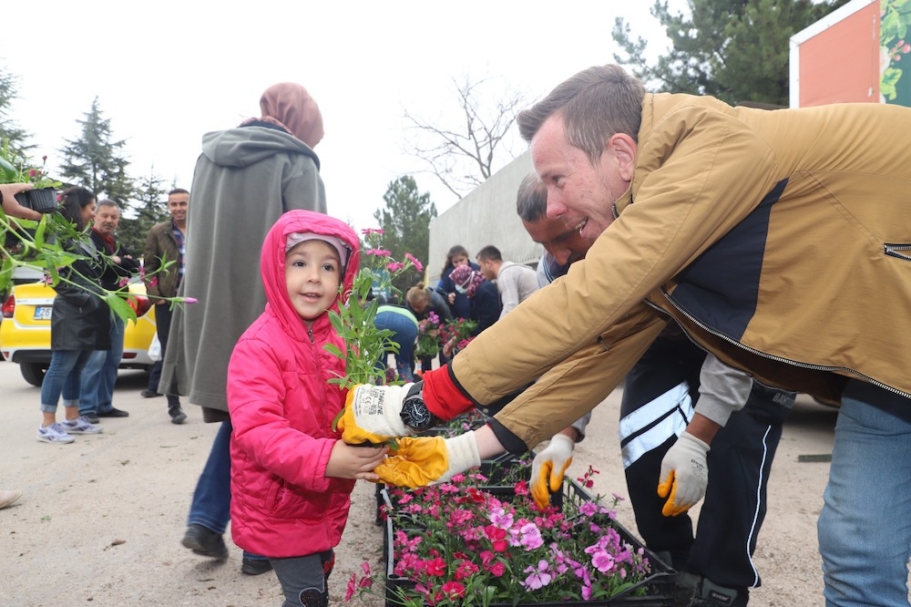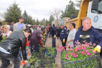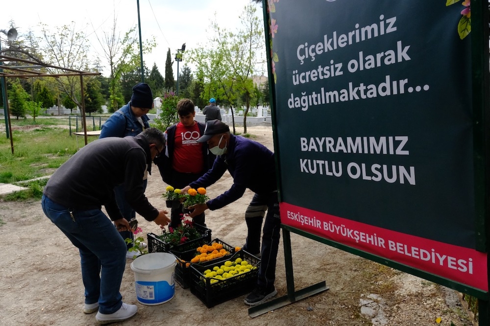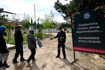 Eskişehir Büyükşehir Belediyesi, Ramazan Bayramı nedeniyle mezarlıklarda yakınlarını ziyarete giden vatandaşlara kendi seralarında yetiştirdiği on binlerce çiçeği ücretsiz olarak dağıttı.