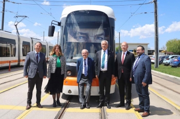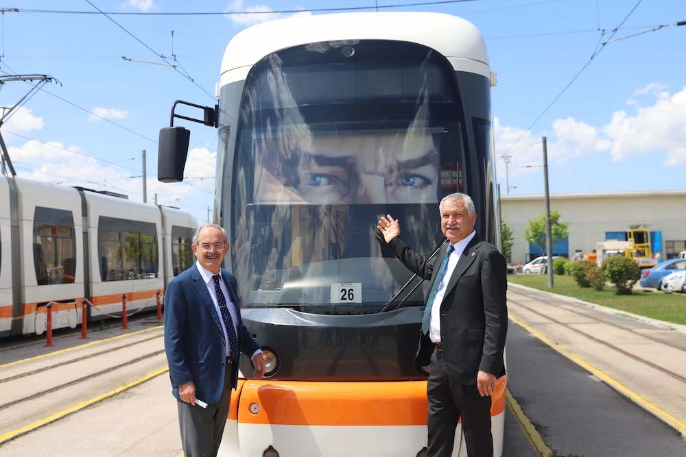 Büyükerşen ve Karalar, ziyaret sonunda tramvay önünde hatıra fotoğrafı çektirdi.