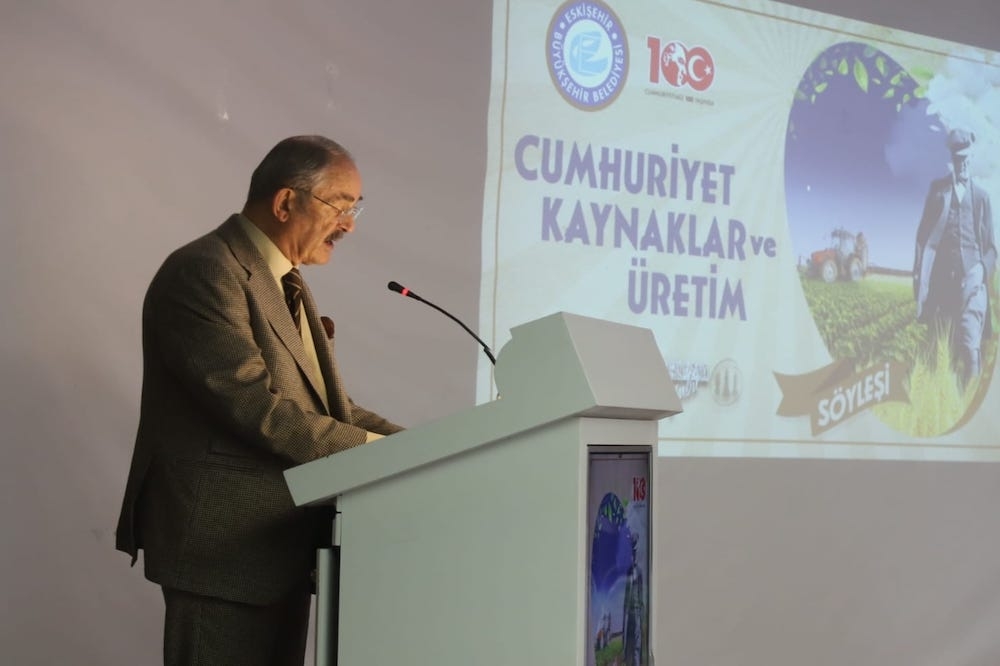 Büyükerşen, “Bugün çok önemli iki Cumhuriyet insanını Eskişehir’de ağırlıyoruz. Sayın Prof. Dr. Bilsay Kuruç ve Sayın Prof. Dr. Cemal Taluğ ile Cumhuriyetimizi, Cumhuriyetin var ettiği kaynakları ve son yıllarda ülke olarak çok da başarılı olamadığımız üretim konusunu ele alacağız. Su, toprak, ormanlar, mineraller gibi doğal kaynaklar, insanlığın yaşamını sürdürebilmesi için temel gereksinimleri karşılar. Ancak, hızlı sanayileşme ve artan tüketim doğal kaynakların aşırı kullanımına ve tükenmesine yol açmaktadır. Bu durum, ekosistemi bozar, biyolojik çeşitliliği azaltır ve iklim değişikliğine neden olur. Doğal kaynakların sürdürülebilir odaklı kullanımı, kaynakların tükenmesini önlemek ve gelecek kuşakların ihtiyaçlarını da karşılayabilmek için gereklidir. Bunun için, tüm bu kaynakların etkin kullanımını sağlamak, geri dönüşümü teşvik etmek ve yenilenebilir kaynaklara yönelmek önemlidir. Ayrıca, tarım ve ormancılık gibi sektörlerde sürdürülebilir uygulamaların benimsenmesi, doğal kaynakların korunmasına katkı sağlar. Üzülerek söylemeliyim ki; tarım başta olmak üzere birçok hayati konuda yanlış politikalar yüzünden Cumhuriyetimizin 100. yılında Türkiye, gençlerin yaşamak istemediği, çiftçinin üretmek istemediği, sanayicinin yatırımdan geri durduğu bir ülke haline geldi. Peki bu olumsuz süreci nasıl tersine çevirebiliriz? Elbette eldeki kaynakları verimli şekilde kullanıp, üreterek, üretmek isteyeni teşvik ederek ve üretilenden katma değer yaratarak. Gelecekte, tarımsal üretim, dünya nüfusunun artışıyla birlikte daha da önemli hale gelecektir. Bu nedenle, sürdürülebilir tarım uygulamalarının benimsenmesi, verimliliğin artırılması ve doğal kaynakların korunması büyük önem taşımaktadır. Sonuç olarak, tarımsal üretimin değerini anlamak ve bu alandaki önemli konuları ele almak için çok kıymetli Bilsay Hocamız ve Cemal Hocamız ile bir araya geldik. Ben kendilerine bizleri kırmayıp geldikleri için teşekkür ediyor, sizleri onlarla baş başa bırakıyorum.” diye konuştu.