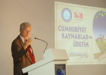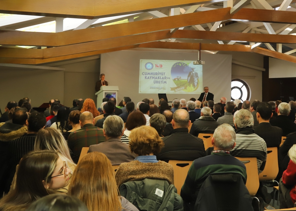“Cumhuriyetimizin 100. yılında daha kararlı ve güçlü olunmalı.” diyen Prof. Dr. Cemal Taluğ, “Cumhuriyet, büyük Atatürk’ün dediği gibi ilelebet payidar kalacaktır. Bu anlamda Cumhuriyetin ilk 15 yılını esas alarak Cumhuriyet ve Tarım ilişkisini ele almak istiyorum. Toplumun temel kaynağı elbette insan ve tarım için de çok önemli. Tarımın yanında sanayisi var. İlk yıllarda gıda dokuma ve askeri ihtiyaçlar için yatırımlar görüyoruz. Tabi hepsi de tarıma dayalı. Tarım demek istihdam demek. Sanayi çok küçük olanaklarla kurulmuş. Tarım çok önemli, çünkü tarım olmadan diğer alanlarda da adım atmak çok zor. Atatürk, Cumhuriyet öncesi tarım hakkında görüşlerini açıklamış ve Cumhuriyetin ilk 15 yılında tarıma çok büyük önem vermiştir. Çiftçiliğin saygın bir meslek olması, haklarının korunması için 1922-1937 yılları arasında Atatürk hep buna vurgu yapmıştır. Neden tarım dersek? Birincisi tarım ekonominin lokomotifi. Atatürk, tam bağımsızlıkla ekonomik bağımsızlığı bir görmüştür. Ekonomiyi güçlendirmemiz lazım. Cumhuriyet kolay kurulmadı, tam bağımsızlık için ekonomik bağımsızlık çok önemlidir. İkincisi ise Cumhuriyet kurulurken düşmanın vatan toprağından atılması sonrası halktan gelen ‘haydi Cumhuriyeti kuralım’ talebiyle yola çıkılmıştır. Cumhuriyet bir halk iradesidir. Cumhuriyetin güçlenmesi halkın güçlenmesidir.” dedi.