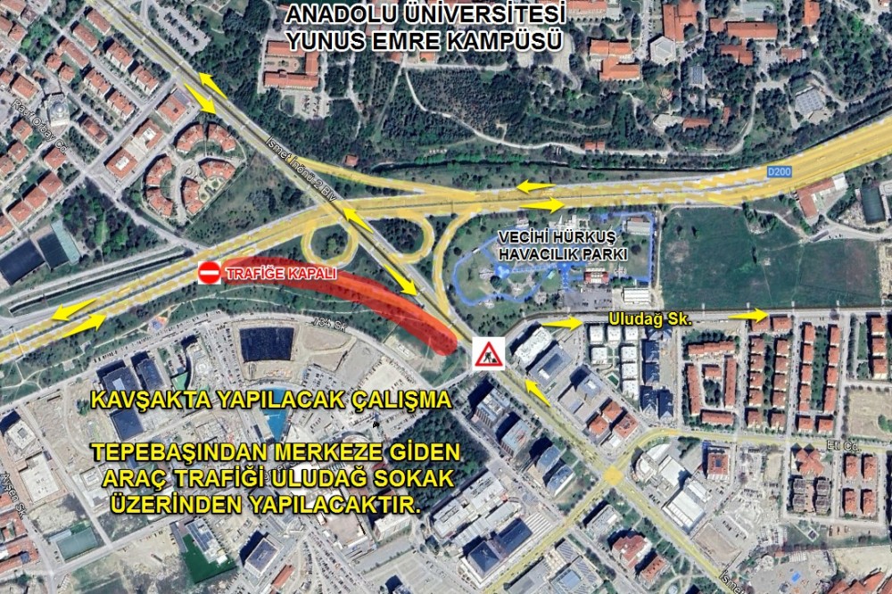Yapılan açıklamaya göre, 10 Kasım Pazartesi gününden itibaren başlayacak çalışmalar kapsamında İsmet İnönü 1 Caddesi, Vecihi Hürkuş Havacılık ve Teknoloji Parkı ve Özdilek’i birbirine bağlayan kavşak 10-14 Kasım tarihleri arasında trafiğe kapatılacak. Çalışma kapsamında çevreyolundan bu kavşağa bağlantı yolu da araç trafiğine kapalı tutulacak olup, Eczacılık Fakültesi istikametinden gelen araçlar Uludağ Sokak’a yönlendirilecek.