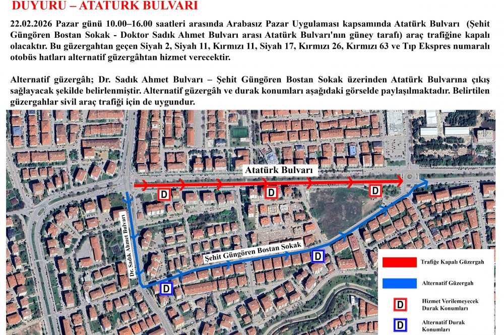 Uygulama süresince alternatif ulaşım güzergâhları planlanırken, acil durumlar, engelli bireylerin ulaşımı ve zorunlu hizmetlerin aksamaması için belediye ekipleri sahada görev yapacak. Arabasız Pazar günleri her ayın son Pazar günü düzenli olarak gerçekleştirilmeye devam edecek.