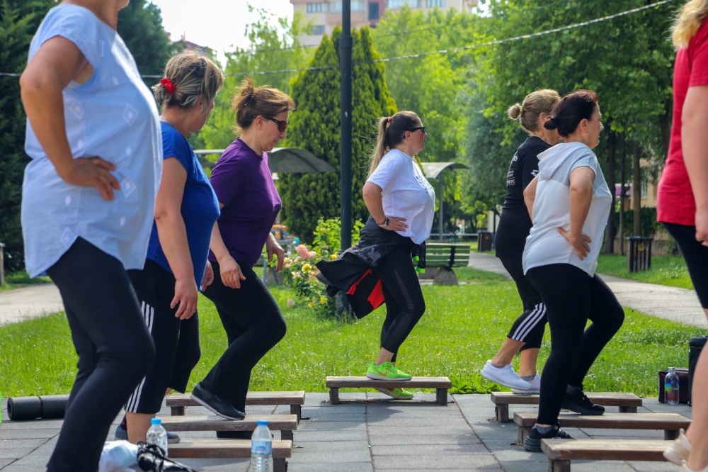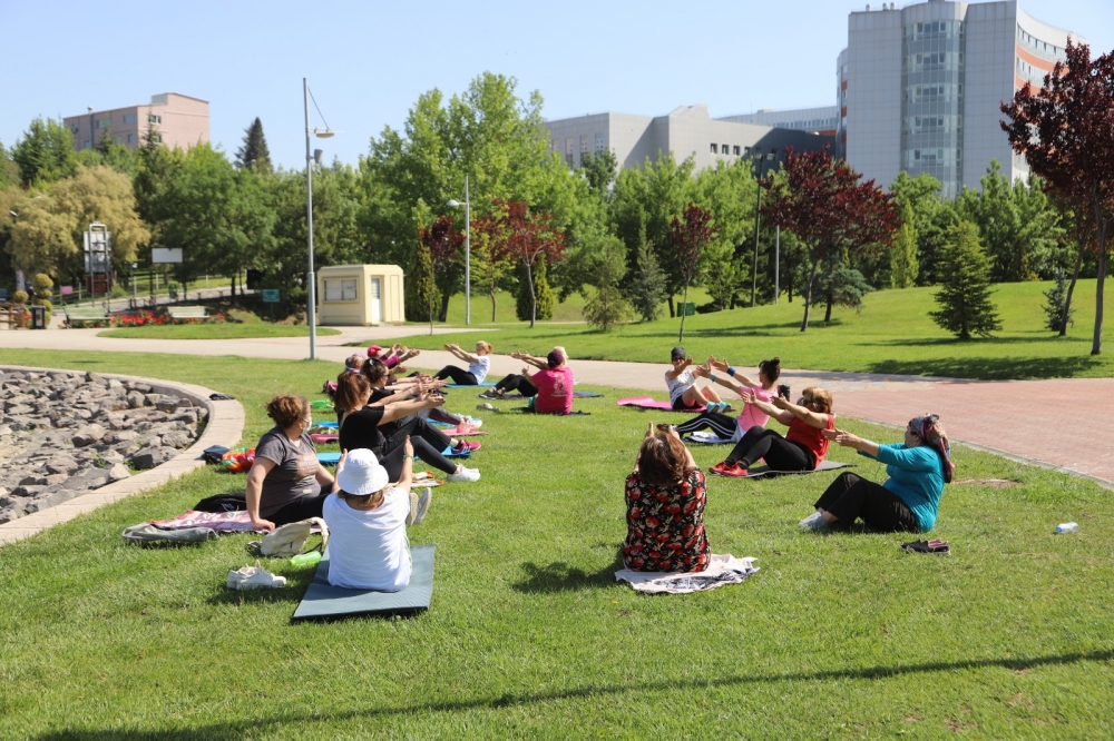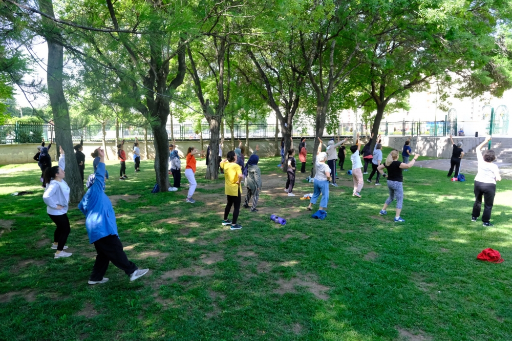 Sabah 09.00-10.00 ile akşam 17.00-18.00 saatleri arasında yapılan etkinliklerde, egzersiz programlarına katılan vatandaşlar açık havada sağlıklı şekilde spor yapıyor.
