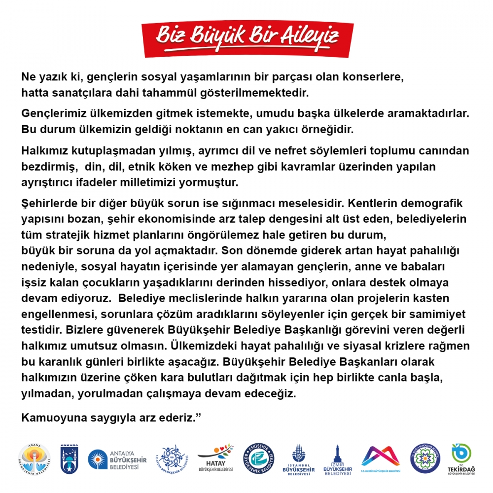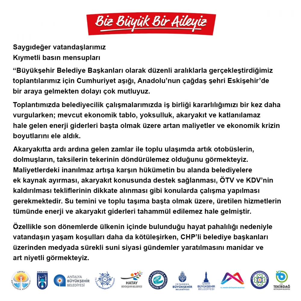 “Büyükşehir Belediye Başkanları olarak düzenli aralıklarla gerçekleştirdiğimiz toplantılarımız için Cumhuriyet aşığı, Anadolu’nun çağdaş şehri Eskişehir’de bir araya gelmekten dolayı çok mutluyuz. Toplantımızda belediyecilik çalışmalarımızda iş birliği kararlılığımızı bir kez daha vurgularken; mevcut ekonomik tablo, yoksulluk, akaryakıt ve katlanılamaz hale gelen enerji giderleri başta olmak üzere artan maliyetler ve ekonomik krizin boyutlarını ele aldık. Akaryakıtta ardı ardına gelen zamlar ile toplu ulaşımda artık otobüslerin, dolmuşların, taksilerin tekerinin döndürülemez olduğunu görmekteyiz. Maliyetlerdeki inanılmaz artışa karşın hükümetin bu alanda belediyelere ek kaynak ayırması, akaryakıt konusunda destek sağlanması, ÖTV ve KDV’nin kaldırılması tekliflerinin dikkate alınması gibi konularda çalışma yapılması gerekmektedir. Su temini ve toplu taşıma başta olmak üzere, üretilen hizmetlerin tümünde enerji ve akaryakıt giderleri tahammül edilemez hale gelmiştir. Özellikle son dönemlerde ülkenin içinde bulunduğu hayat pahalılığı nedeniyle vatandaşın yaşam koşulları daha da kötüleşirken, CHP’li belediye başkanları üzerinden medyada sürekli suni siyasi gündemler yaratılmasını manidar ve art niyetli görmekteyiz. Ne yazık ki, gençlerin sosyal yaşamlarının bir parçası olan konserlere, hatta sanatçılara dahi tahammül gösterilmemektedir. Gençlerimiz ülkemizden gitmek istemekte, umudu başka ülkelerde aramaktadırlar. Bu durum ülkemizin geldiği noktanın en can yakıcı örneğidir. Halkımız kutuplaşmadan yılmış, ayrımcı dil ve nefret söylemleri toplumu canından bezdirmiş, din, dil, etnik köken ve mezhep gibi kavramlar üzerinden yapılan ayrıştırıcı ifadeler milletimizi yormuştur. Şehirlerde bir diğer büyük sorun ise sığınmacı meselesidir. Kentlerin demografik yapısını bozan, şehir ekonomisinde arz talep dengesini alt üst eden, belediyelerin tüm stratejik hizmet planlarını öngörülemez hale getiren bu durum, büyük bir soruna da yol açmaktadır. Son dönemde giderek artan hayat pahalılığı nedeniyle, sosyal hayatın içerisinde yer alamayan gençlerin, anne ve babaları işsiz kalan çocukların yaşadıklarını derinden hissediyor, onlara destek olmaya devam ediyoruz. Belediye meclislerinde halkın yararına olan projelerin kasten engellenmesi, sorunlara çözüm aradıklarını söyleyenler için gerçek bir samimiyet testidir. Bizlere güvenerek Büyükşehir Belediye Başkanlığı görevini veren değerli halkımız umutsuz olmasın. Ülkemizdeki hayat pahalılığı ve siyasal krizlere rağmen bu karanlık günleri birlikte aşacağız. Büyükşehir Belediye Başkanları olarak halkımızın üzerine çöken kara bulutları dağıtmak için hep birlikte canla başla, yılmadan, yorulmadan çalışmaya devam edeceğiz. Kamuoyuna saygıyla arz ederiz.”