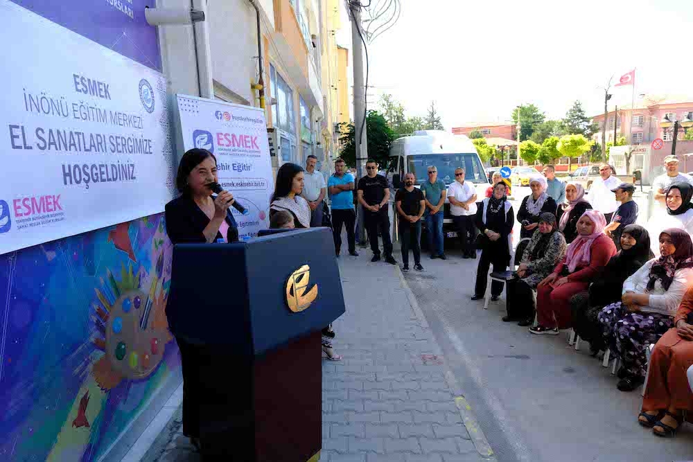 2021 yılında hizmete açılan ESMEK İnönü Eğitim Merkezi kursiyerlerinin eserlerinden oluşan Yıl Sonu El Sanatları Sergisi’nde karakalem resim, miyuki takı tasarımı, kadın giysileri dikimi, iğne oyası, örgüler ve İnönü kadifesinden oluşan 374 eser sergilendi.