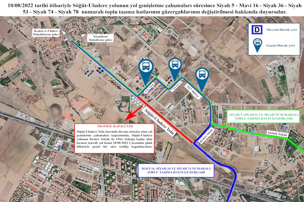 Ekipler yoldaki ikinci etap çalışmasının da başlayacağını ve bu nedenle geçici bazı düzenlemeler yapıldığını kaydederek, “Söğüt-Uludere Yolu üzerinde devam etmekte olan yol genişletme çalışmaları kapsamında, Söğüt-Uludere yolunun Kenter Sokak ile 1516. Sokağa kadar olan kısmı 10 Ağustos Çarşamba günü itibariyle geçici bir süre trafiğe kapatılacaktır. Sürücüler Aktürk Sokak, Kenter Sokak, 1527. Bulvar, 1500. Bulvar, 1521. Sokak, 1516. Sokak üzerinden Yaşamkent ile Keskin ve Uludere Mahallelerine ulaşım sağlayabileceklerdir. Toplu taşımada da mavi 16, siyah 36 ve siyah 74 numaralı hatlar Kenter Sokak üzerinden, siyah 5, siyah 53 ve siyah 78 numaralı otobüsler Aktürk Sokak üzerinden 1527. Bulvar, 1500. Bulvar, 1521. Sokak, 1516. Sokak güzergahından seferlerine devam edecektir. Bu bölgelerde kurulan geçici duraklardan vatandaşlarımız faydalanmaya devam edecektir” dediler.