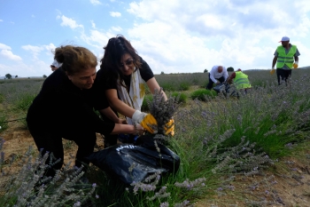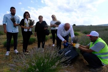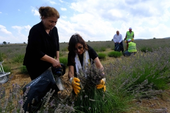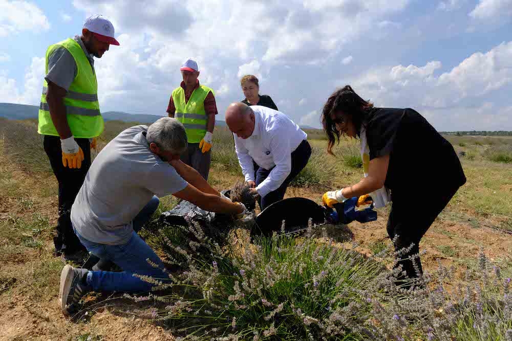 Ekonomik yönden zor günlerden geçen üreticilere destek amacıyla hayata geçirilen projelerden biri olan 55 dekarlık lavanta bahçesinde ot temizleme ve çapalama çalışmalarının sonrasında lavanta hasadına geçildi.