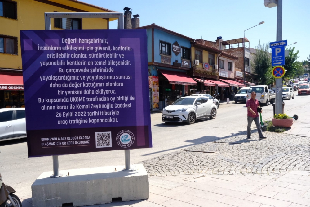 Buna göre Odunpazarı Kentsel Sit Alanı içinde kalan Kemal Zeytinoğlu Caddesi ve bağlantılı sokaklar belirlenen saatlerde araç trafiğine kapatılacak. Konuyla ilgili Eskişehir Büyükşehir Belediyesi tarafından bölgeye bilgilendirici afişler asılırken, vatandaşları ve bölge esnafını bilgilendirmek amacıyla hazırlanan QR kodlu broşürler dağıtılıyor.