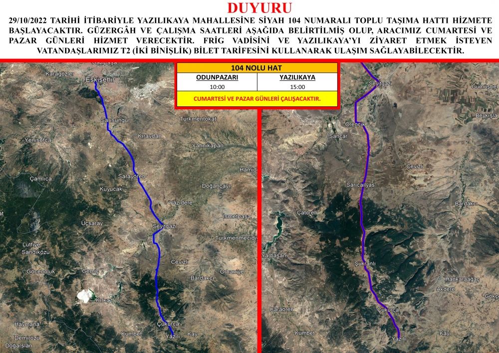 Eskişehir’den Han ilçesi Yazılıkaya Mahallesi’ne otobüs seferleri 29 Ekim Cumartesi günü itibariyle başlıyor. Büyükşehir Belediyesi Ulaşım Dairesi Başkanlığı Toplu Taşıma Şube Müdürlüğü, 29 Ekim Cumartesi günü itibariyle Eskişehir-Yazılıkaya arasında hafta sonlarında seferler düzenleyecek.