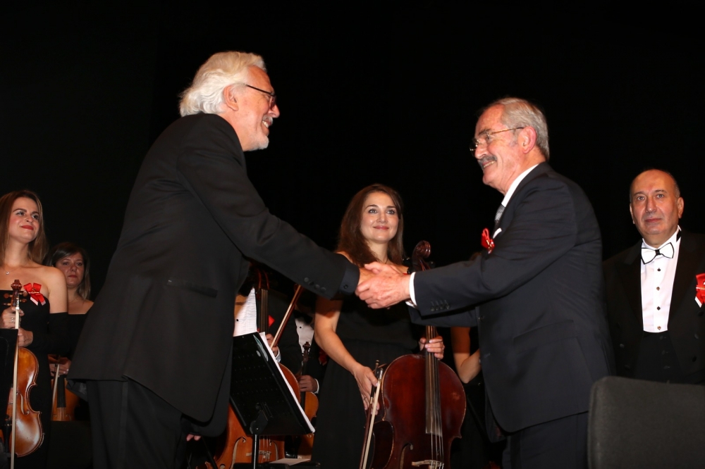 Konserin sonunda sahneye çıkan Prof. Dr. Yılmaz Büyükerşen, herkesin cumhuriyet bayramını kutladı ve orkestrayı, solistleri ve anlatıcıları tebrik etti.