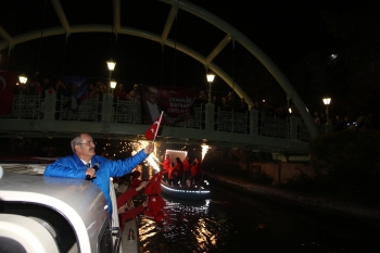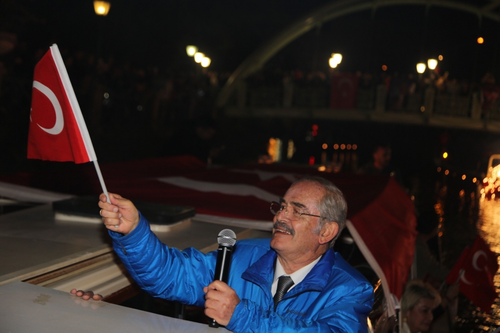 Işık gösterileri, meşaleler ve marşlar eşliğinde yapılan Fener Alayı’nda Eskişehir Büyükşehir Belediye Başkanı Prof. Dr. Yılmaz Büyükerşen, CHP Eskişehir Milletvekilleri Jale Nur Süllü ve Utku Çakırözer, Odunpazarı Belediye Başkanı Kazım Kurt, Han Belediye Başkanı Erdal Şanlı, Seyitgazi Belediye Başkanı Uğur Tepe, Eskişehirli gaziler ve belediye meclis üyeleri bot üzerinden vatandaşları selamlayarak bayramlarını kutladı.