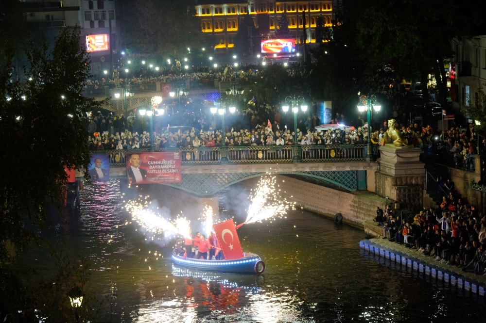 Cumhuriyetimizin 99. yılı, Cumhuriyet şehri Eskişehir’e yakışan bir coşkuyla kutlandı. Eskişehir Büyükşehir Belediyesi’nin 29 Ekim Cumhuriyet Bayramı heyecanını tüm şehre yaydığı etkinlikler kapsamında Porsuk Çayı’nda düzenlenen Fener Alayı’nı on binlerce Cumhuriyet sevdalısı büyük bir heyecanla takip etti. Burada Eskişehirlilere seslenen Başkan Büyükerşen, “Güzel Eskişehir’im, Cumhuriyet sevdalısı, Atatürk’ün askerleri Eskişehirliler; Cumhuriyet Bayramımız kutlu olsun. Sizlerle gurur duyuyorum.” dedi.