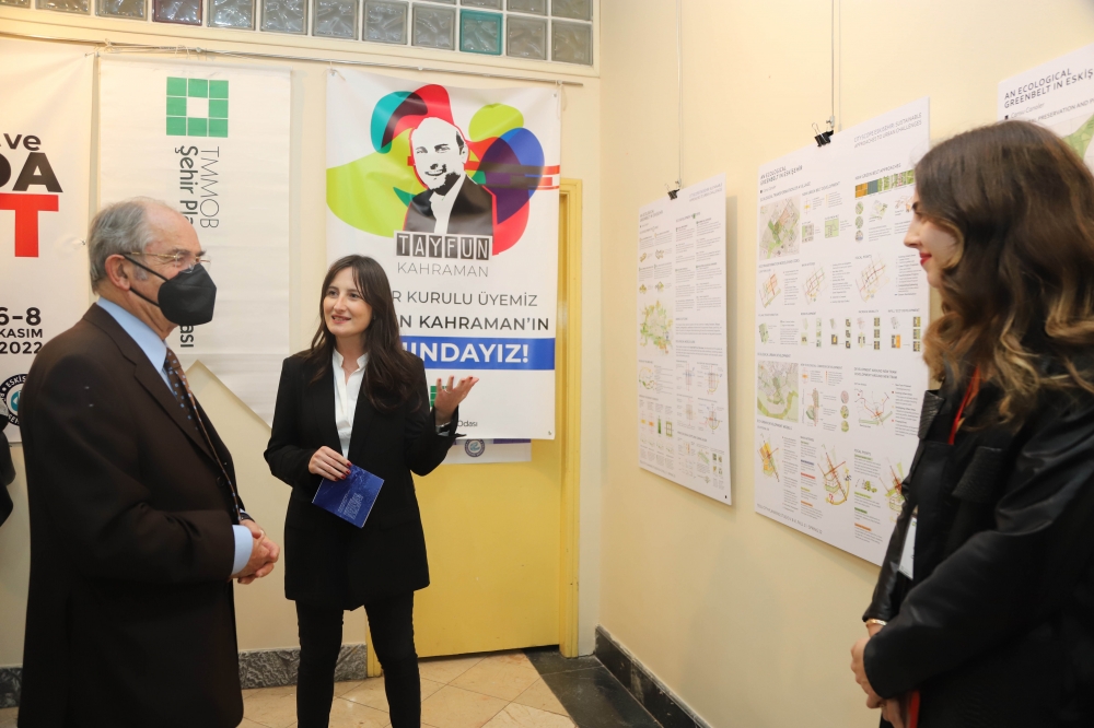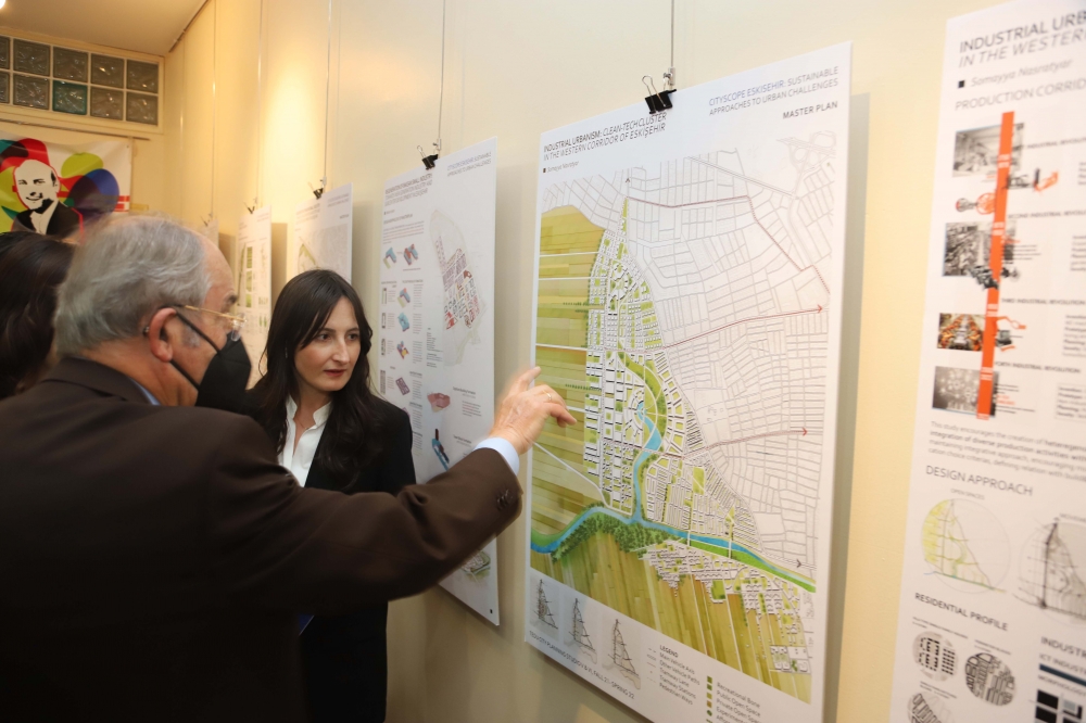 TMMOB Şehir Plancıları Odası tarafından 8 Kasım Dünya Şehircilik Günü 46. Kolokyumu kapsamında açılan proje sergisini inceleyen Başkan Büyükerşen, projeler hakkında detaylı bilgi aldı.
