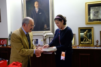 Başkan Büyükerşen de nazik ziyaret nedeniyle Payzın’a teşekkür etti. Daha sonra Büyükerşen Payzın’a, “Zamanı Durduran Saat” adlı kitabını imzalayarak hediye ederken karşılıklı görüş alışverişinin yapıldığı ziyaret çektirilen fotoğraf ile sona erdi.