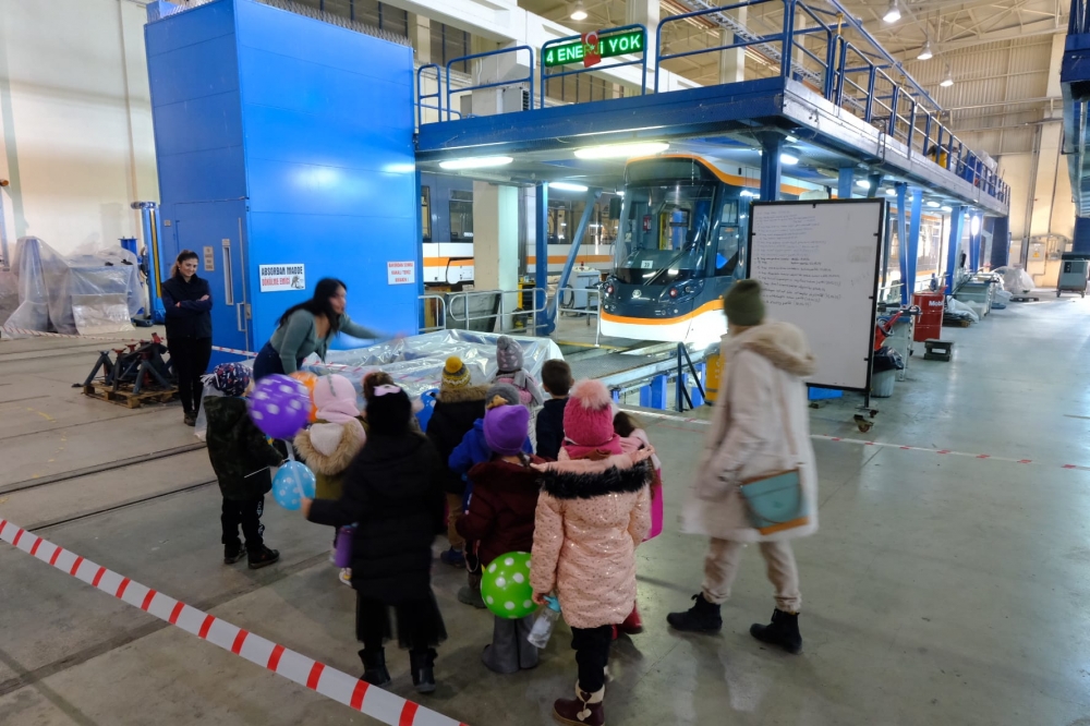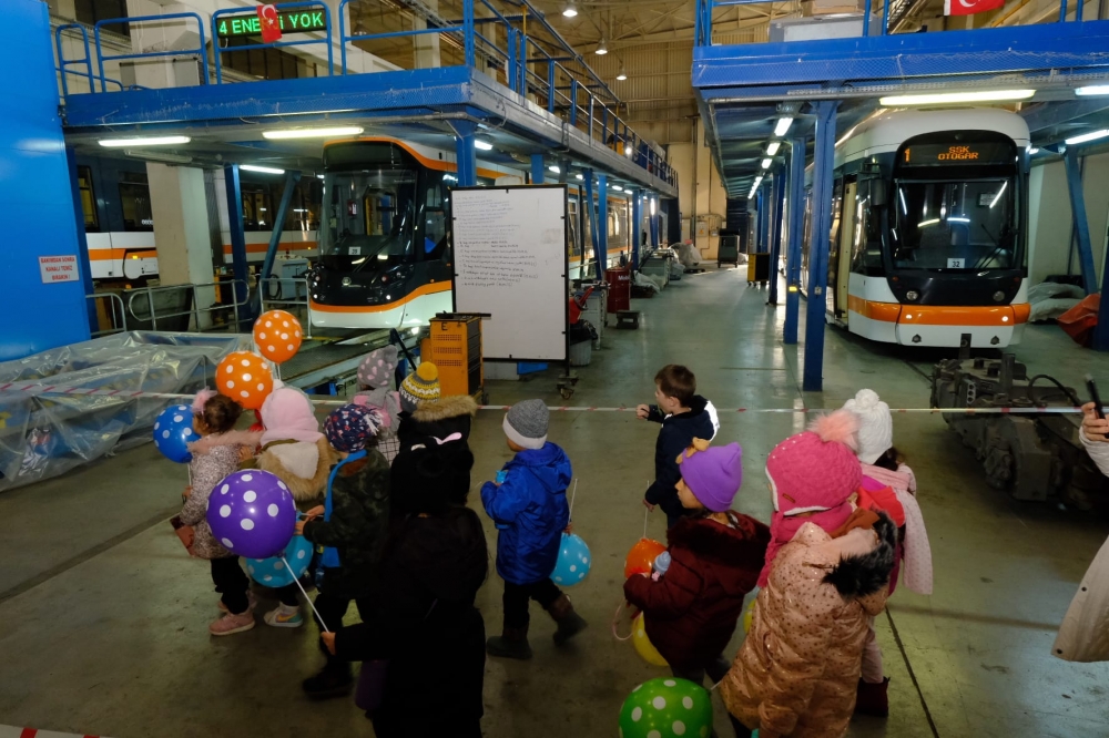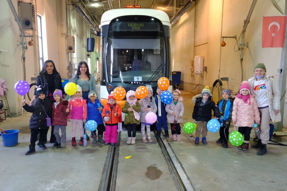 Barbaros İlkokulu ana sınıfı öğrencileri Estram’ı ziyaret ettiler. Ellerinde balonlarla tesislerde gezen minikler, tramvayların çalışma sistemi ve toplu taşımada uyulması gereken kurallar başta olmak üzere birçok konuda bilgilendirildiler.