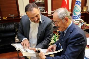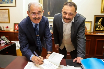 Başkan Büyükerşen de nazik ziyaret nedeniyle teşekkür ederken, Erkin’in okuyup, bitirdiği ve yanında bulundurduğu “Zamanı Durduran Saat” adlı kitabını imzaladı.