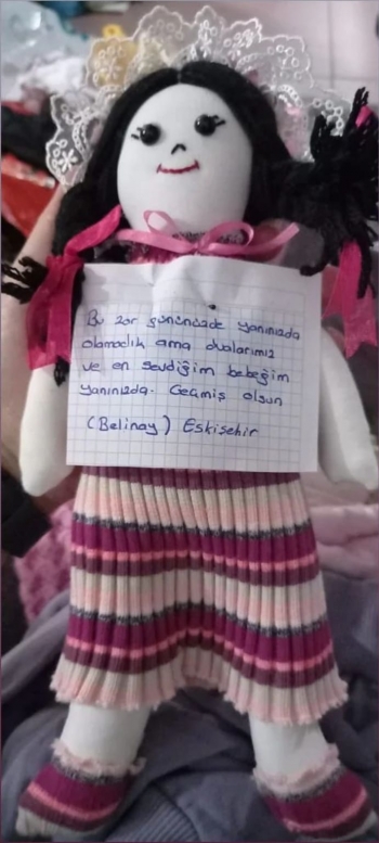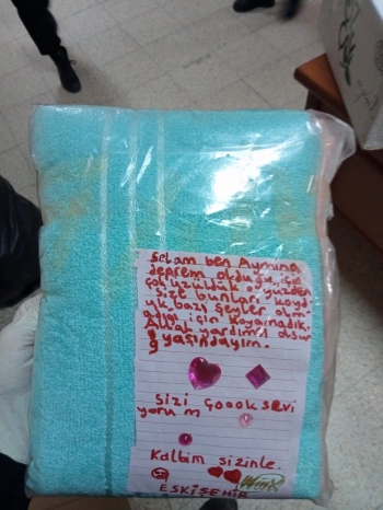 Eskişehirlilerin bağış için akın ettiği merkezlerde belediye görevlileri ve gönüllüler, yardım kolilerinden çıkan notlarla duygusal anlar yaşadı. 9 yaşındaki Aymina’nın giysilerin üzerine koyduğu, “Selam ben Aymina. Deprem olduğu için çok üzüldük o yüzden bunları size koyduk. Bazı şeyler olmadığı için koyamadık. Allah yardımcınız olsun 9 yaşındayım.” yazılı notu ile Belinay’ın, “Bu zor gününüzde yanınızda olamadık ama en sevdiğim bebeğim yanınızda. Geçmiş olsun.” yazılı notu görevlileri ve gönüllüleri duygulandırdı.