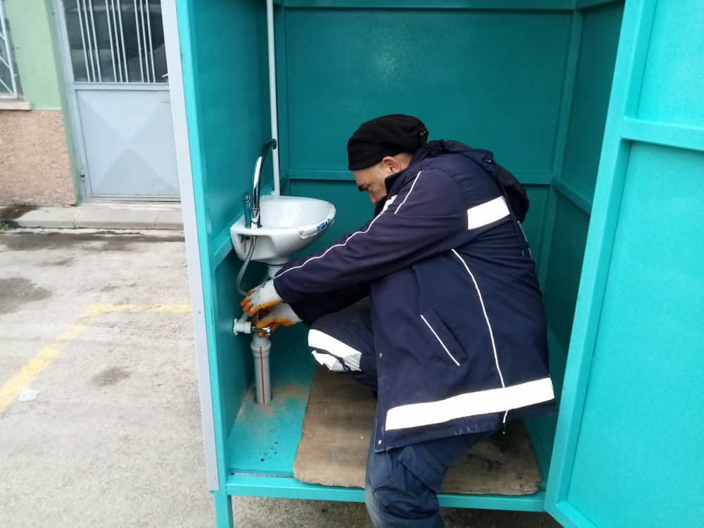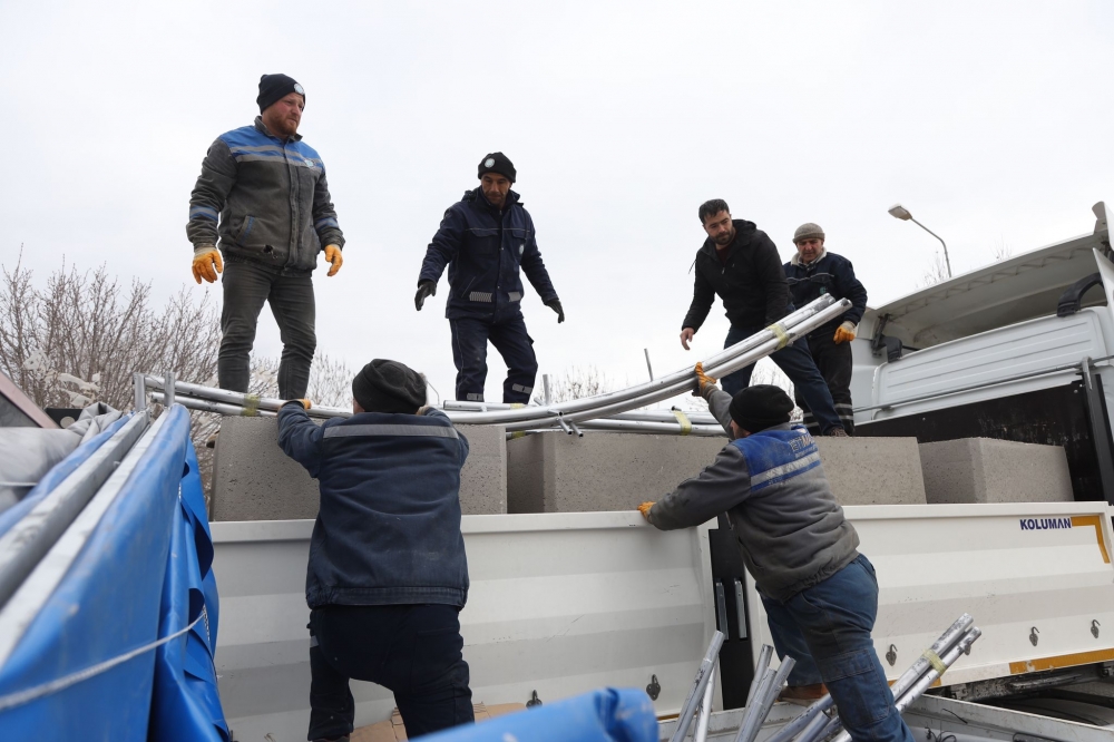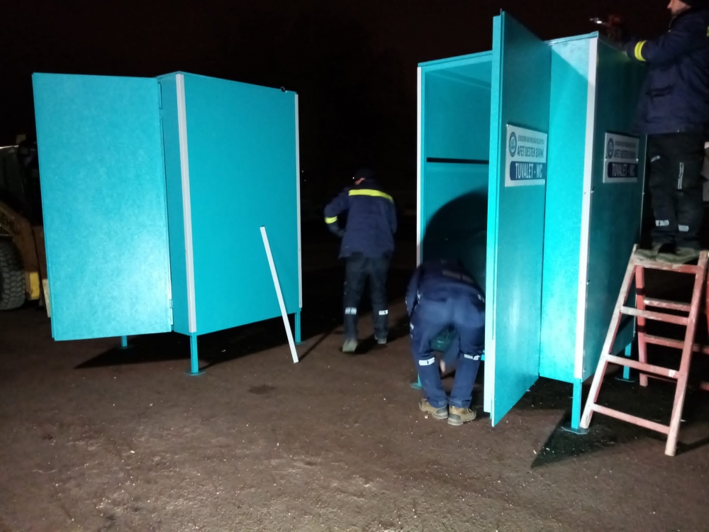 Afet bölgesinde acil ihtiyaçlardan olan mobil tuvalet konusunda da atölyeler yoğun bir şekilde çalışıyor. Büyükşehir Belediyesi Park ve Bahçeler atölyelerinde üretilen seyyar tuvaletler ile Büyükşehir iştiraki İmar A.Ş.’nin ürettiği deşarj alt yapı malzemeleri bölgeye sevk edildi. Atölyelerde gece gündüz üretimi devam eden seyyar tuvaletler kamyon ve TIR’lara yüklenerek Hatay başta olmak üzere afetten etkilenen illere gönderildi. Bu arada mobil tuvalet altı beton box, ısı yalıtımlı çadırlar, soba, kömür ve odunların da sevkiyatı sürüyor.