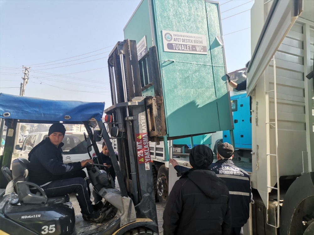 Deprem felaketi sonrası bölgede en acil ihtiyaçlardan olan tuvalet konusunda Eskişehir Büyükşehir Belediyesi atölyelerinde üretilen seyyar tuvaletler, Hatay’a ulaştırılarak ekipler tarafından kurulmaya devam ediyor. Eskişehir’den yapılan sevkiyatlarda seyyar tuvaletlerle birlikte hijyen malzemeleri de gönderiliyor.