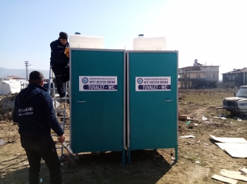 Büyükşehir Belediyesi iştiraki İmar A.Ş. deşarj alt yapı malzemelerini üretirken, Büyükşehir Belediyesi Park ve Bahçeler atölyelerinde üretimi yapılan seyyar tuvaletler afet bölgesine ulaşmaya devam ediyor.