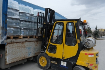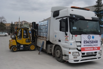 Eskişehir Büyükşehir Belediyesi, ESKİ Genel Müdürlüğü ve Eskişehir Sanayi Odası iş birliğiyle Hatay’a 2 TIR pet şişe Kalabak suyu gönderildi.