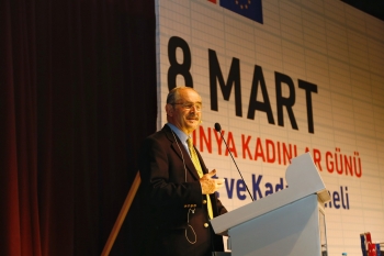 Avrupa Birliği (AB) Türkiye Delegasyonu Başkanı Büyükelçi Nikolaus Meyer-Landrut ise yaptığı açılış konuşmasında, “Bugün burada olmaktan dolayı çok mutluyum. 8 Mart Dünya Kadınlar Günü’nü kutlarken aklımızda yaşamını kaybedenler ve depremden etkilenen 11 şehir var. Zarar tahmin edilenin çok üzerinde. Geçmiş olsun Türkiye. Binlerce insan canlarını binlerce insan evlerini kaybetti. Bildiğiniz üzere AB ülkeleri de yardım sağlamaya devam ediyor. AB üyesi ülkeler 1750 kişiden fazla arama kurtarma ekibi ve 111 arama kurtarma köpeği ile Türkiye’deydi. Sağlık ekipleri geldi, sahra hastaneleri kuruldu. Medikal yardımlar başta olmak üzere ayni yardımlar sağlandı. Bizler koordinasyon içinde sağlık, suya erişim, barınma ve gıda gibi destekler sağlıyoruz. Tabi daha fazlasını yapmak gerekiyor. Türkiye’ye sağladığımız destek ve dayanışma devam edecek. AB Konseyi adına bir donörler konferansı yapılması çağrısında bulundu. Bu konferansta yardımları koordine etmek ve daha fazla katkıda bulunmak amaçlanıyor. Türkiye’ye elimizden geldiğince desteğimiz sürecek. Büyük afete rağmen kadınların başarılarını göstermek, farkındalık yaratmak adına 8 Mart’ta bu etkinliği gerçekleştiriyoruz. Bu etkinliği kadınlara her zaman destek veren Eskişehir’de birlikte yapıyor olmaktan dolayı çok mutluyum. Eskişehir toplumsal cinsiyete duyarlı planlama ve bütçe projesinin yürütüldüğü 4 pilot ilden bir tanesi. Eskişehir toplumsal cinsiyet eşitsizliğinin ortadan kaldırılması adına başarılı çalışmalar yapan kadın dostu bir şehir. Bu deprem sonrası yapılan müdahalelerde yapılan yardımlarda kadınların karar vermede ne kadar önemli olduğunu görüyoruz. Deprem sonrası hepiniz destek oluyorsunuz. Kadınlar var, çocuklar var. Gösterdiğiniz misafirperverlikten dolayı çok teşekkür ederim. Bugün Eskişehir’de sizlerle birlikte olmaktan dolayı çok teşekkür ediyor, Başkan Yılmaz Büyükerşen’e de çok teşekkür ederim. Kadın Danışma Merkezini ziyaret ettik ve çok başarılı çalışmalar yapıldığını gördük. Tebrik ediyorum.” dedi.