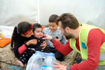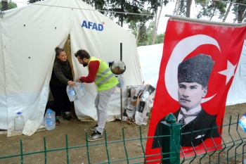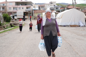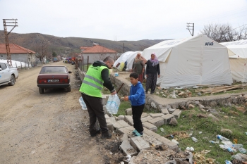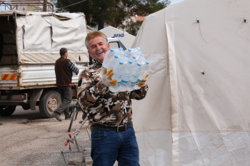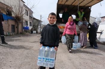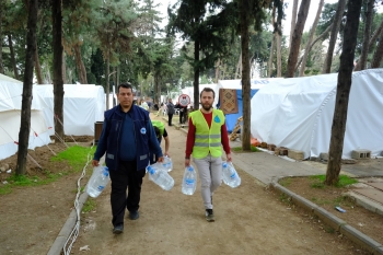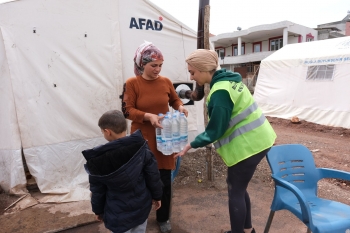 AFAD koordinasyonunda dağıtımları yapılan pet şişe Kalabak suları çadır kentler, konteyner kentler, il, ilçe merkez ve mahallelerde vatandaşlara ulaştırılıyor.