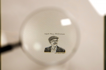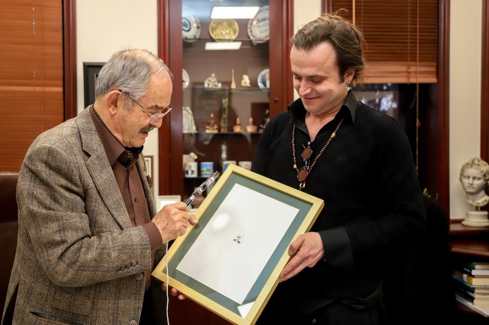 Görüş alışverişinin ardından Dr. Alpay Burak Doğru, Büyük Önder Mustafa Kemal Atatürk dışında ilk kez Başkan Büyükerşen için çizdiği 20 x 25 mm boyutlarındaki mikro portresini hediye etti.