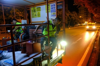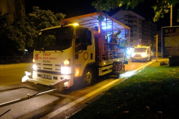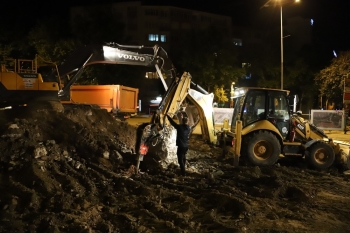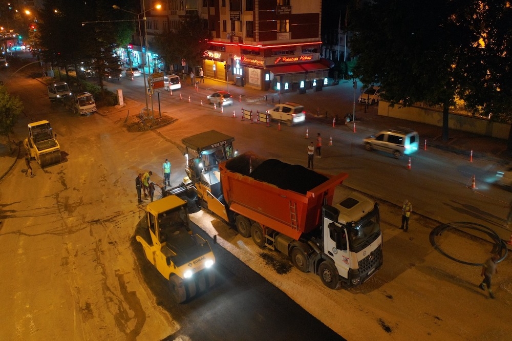 “2. Etap Yol ve Tretuvar Düzenleme Çalışmaları”nın başlamasıyla birlikte trafik yoğunluğunun olmadığı 22.00-06.00 saatleri arasında da ekipler gece mesaisini de sürdürüyor.