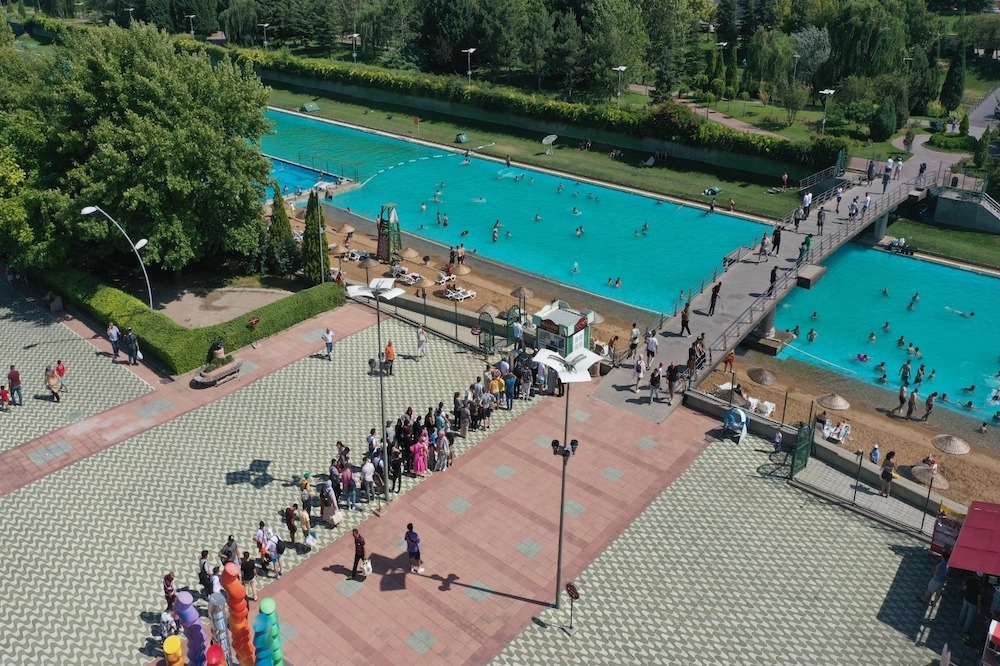 Kentpark’ta 350 metre uzunluğunda ve olimpik havuzu da bulunan yapay plajda, boğulma vakalarına karşı cankurtaranlar da görev yapıyor.