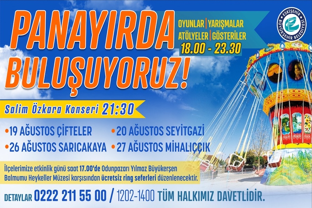 Eskişehir Büyükşehir Belediyesi, düzenlediği panayırlarla coşkuyu ilçelerle buluşturacak. Çifteler, Seyitgazi, Sarıcakaya ve Mihalıççık ilçelerinde gerçekleştirilecek olan panayırlarda birbirinden renkli atölyeler ve Eskişehir’in sevilen sanatçısı Salim Özkara konserinin yanı sıra ilçelerdeki esnaf ve üreticiler satış yaparak gelir elde edebilecek.