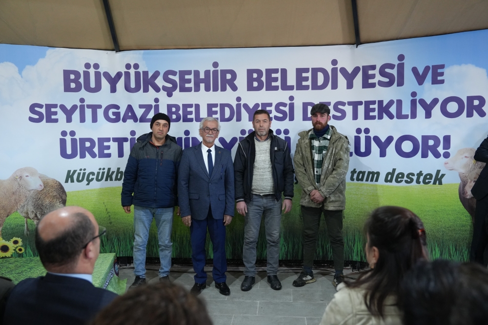 Seyitgazi ve mahallelerinde 25 aileye verilecek olan 1 koç ve 9 koyun olmak üzere toplamdaki 250 küçükbaş hayvan ise Büyükşehir Belediyesi Tarımsal Hizmetler Dairesi Başkanlığı yetkilileri tarafından hak sahiplerine teslim edilmeye başlandı. Bu arada hak sahiplerine 2 adetten toplam 50 adet koyun yemliği ile 1’er kutu mineral blok hediye edildi.