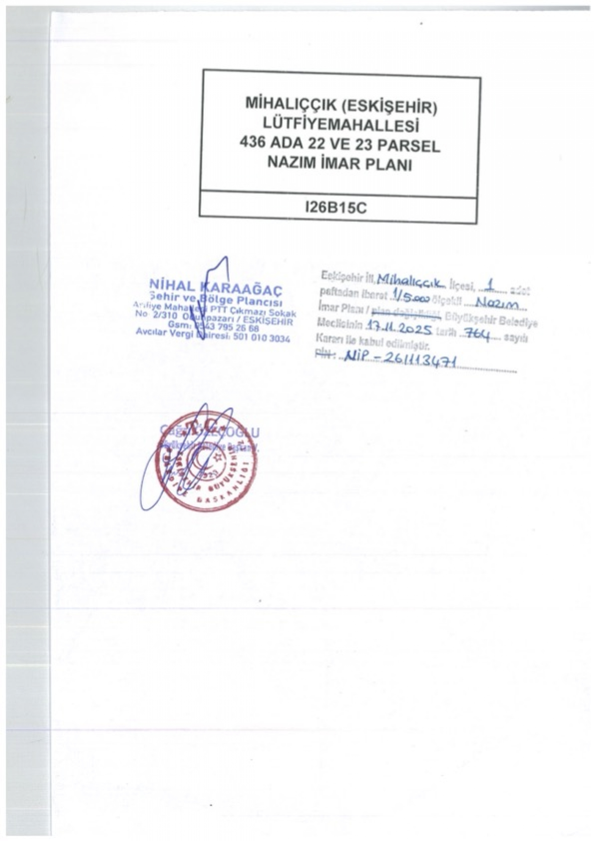 | Karar No: 764 | İlçe: Mihalıççık | Mahalle: Lütfiye Mahallesi |